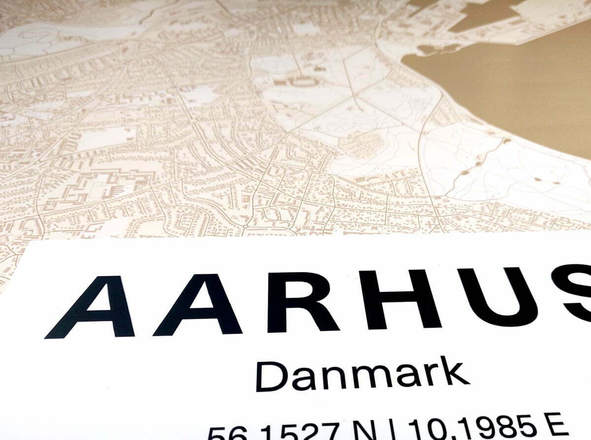 Vi har udviklet speciel software, hvor vi generere landkort filerne i fuld trykopløsning - selv i 70x100cm formatet. Opsætningen af plakaterne foregår automatiseret med professionelle DTP programmer - alt det gør at vores trykte plakater står super skarpt.